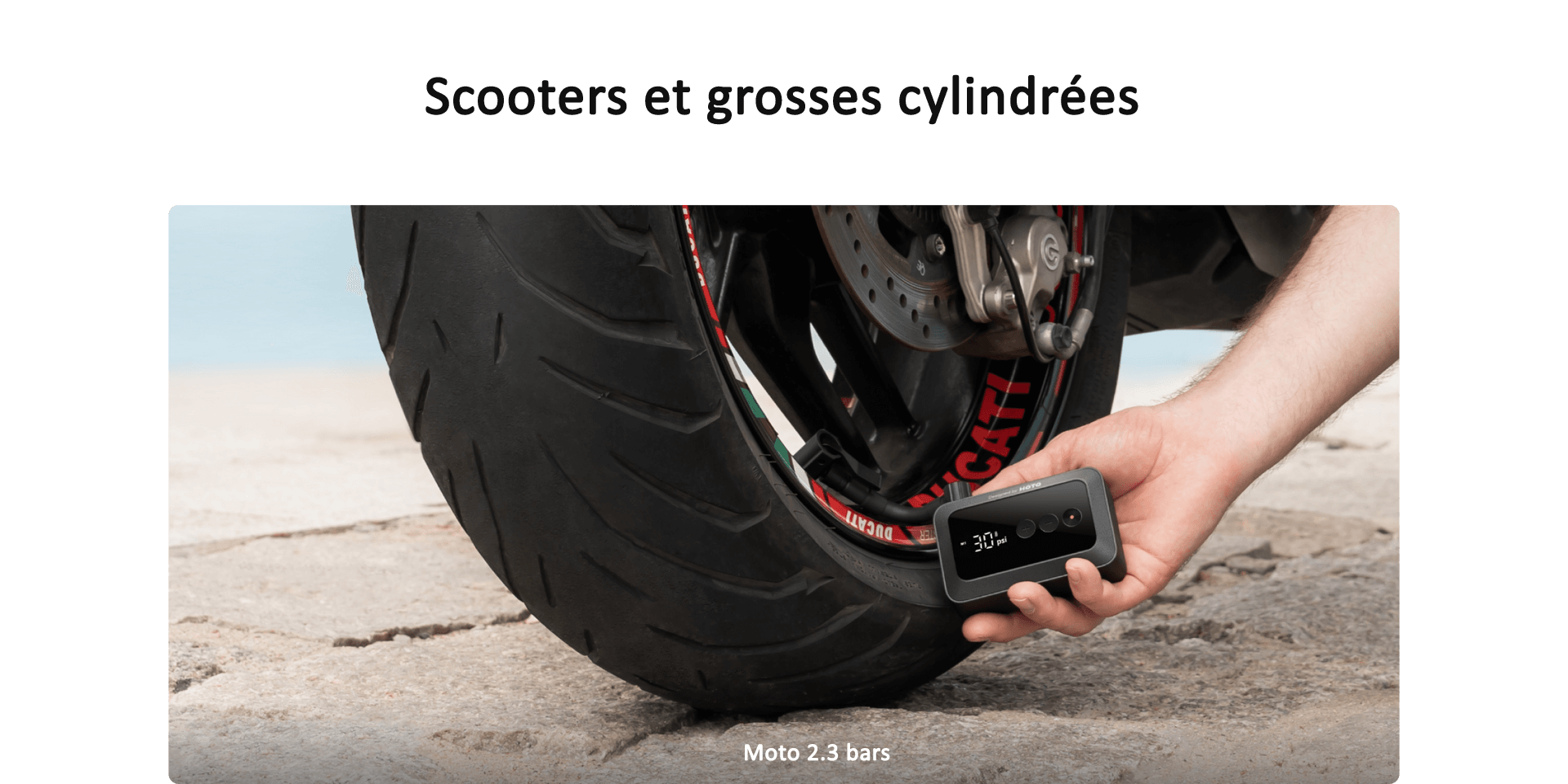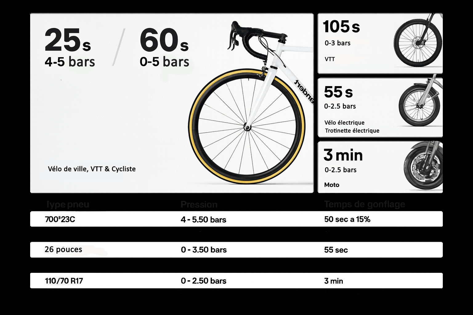 - ✓ Gonfle un pneu de moto en 25 secondes