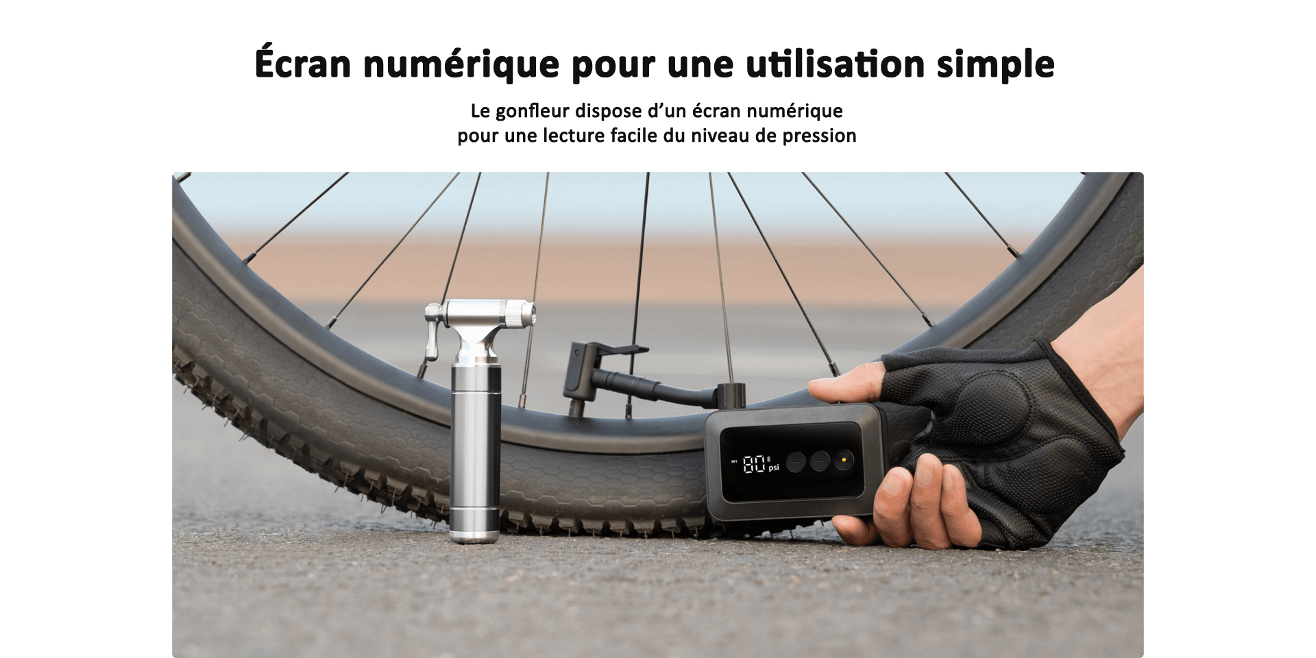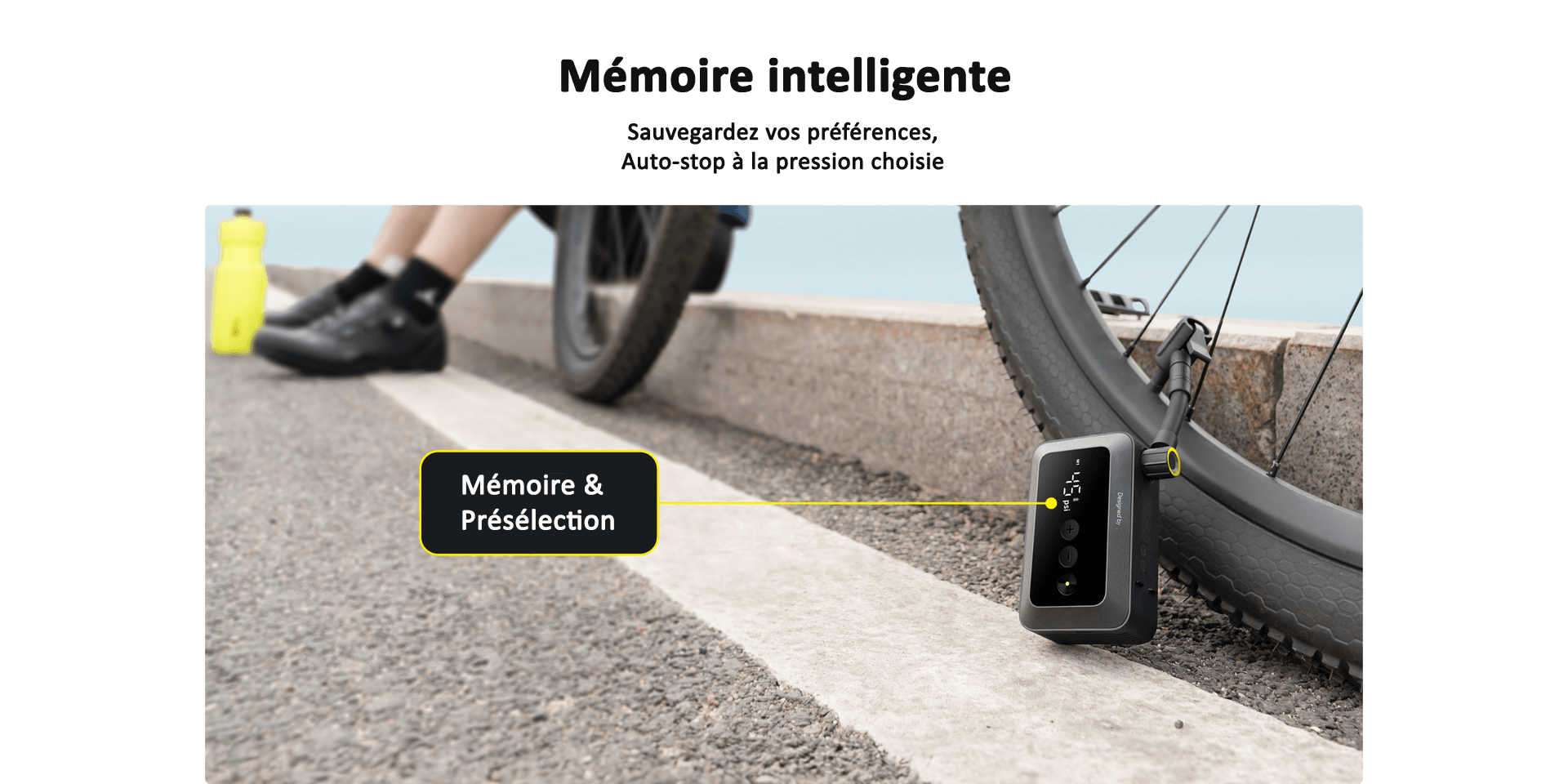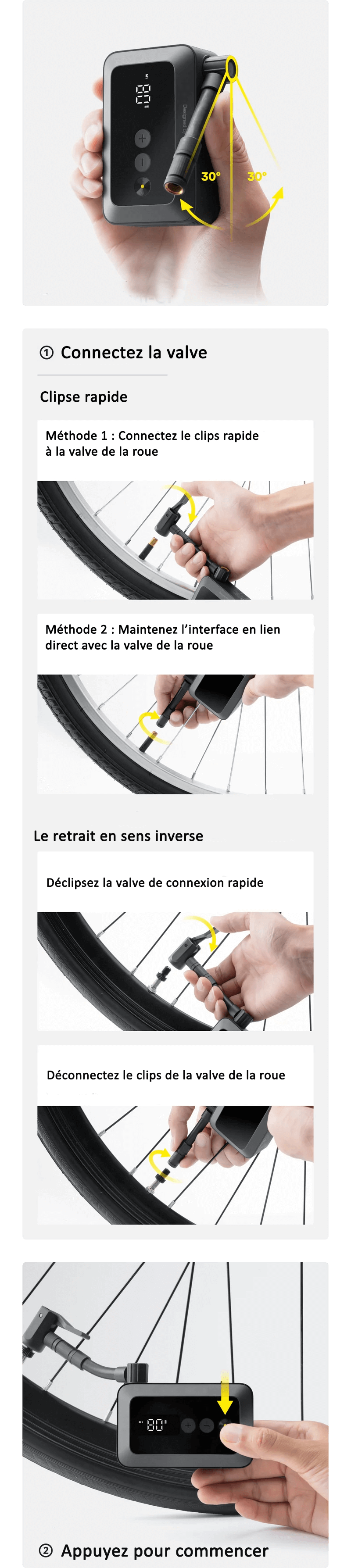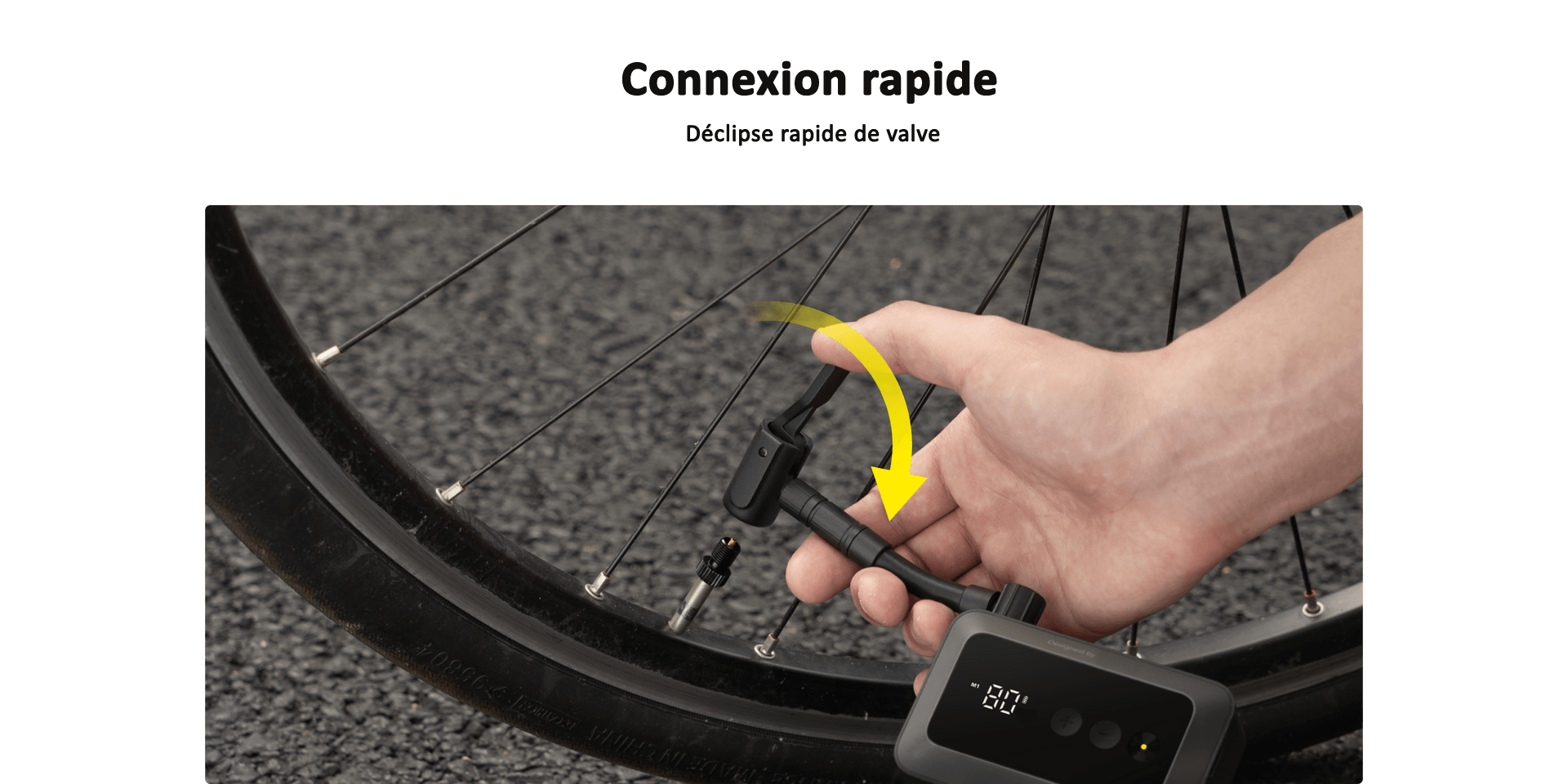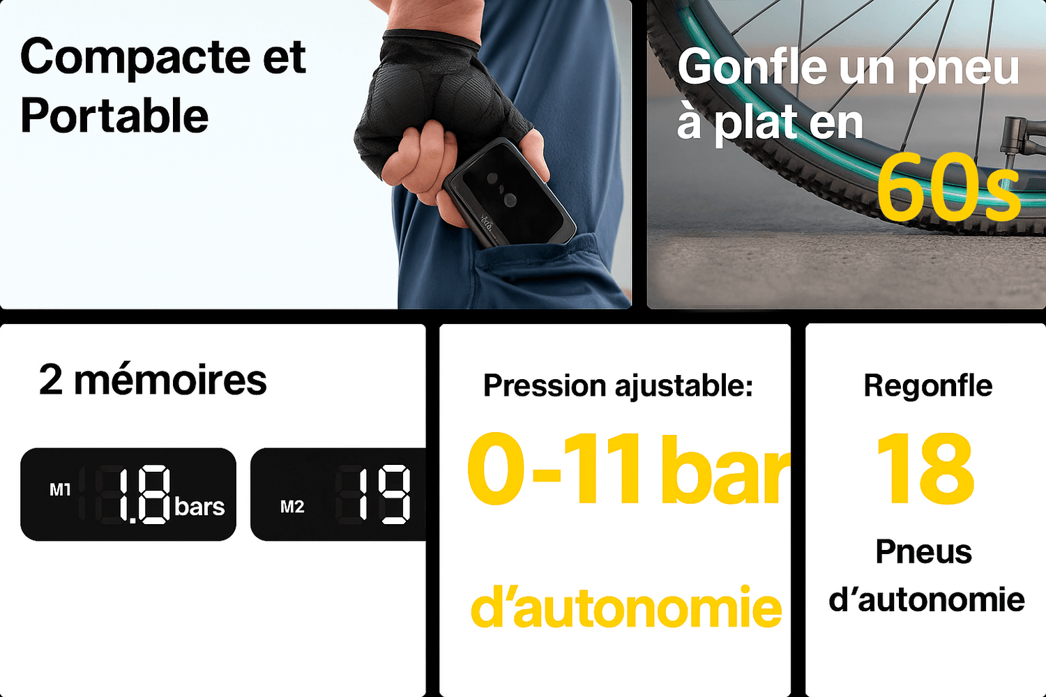 Capacité jusqu'à 11 bars et un gonflage ultra-rapide de 25 secondes, il est idéal pour les cyclistes et les motocyclistes en déplacement.