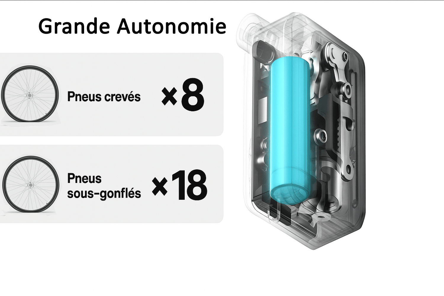 Equipé d'une batterie Lithium-ion de 3 600 mAh, il peut gonfler 8 pneus à plat d'affilé et 18 pneus sous-gonflés d'affilé.